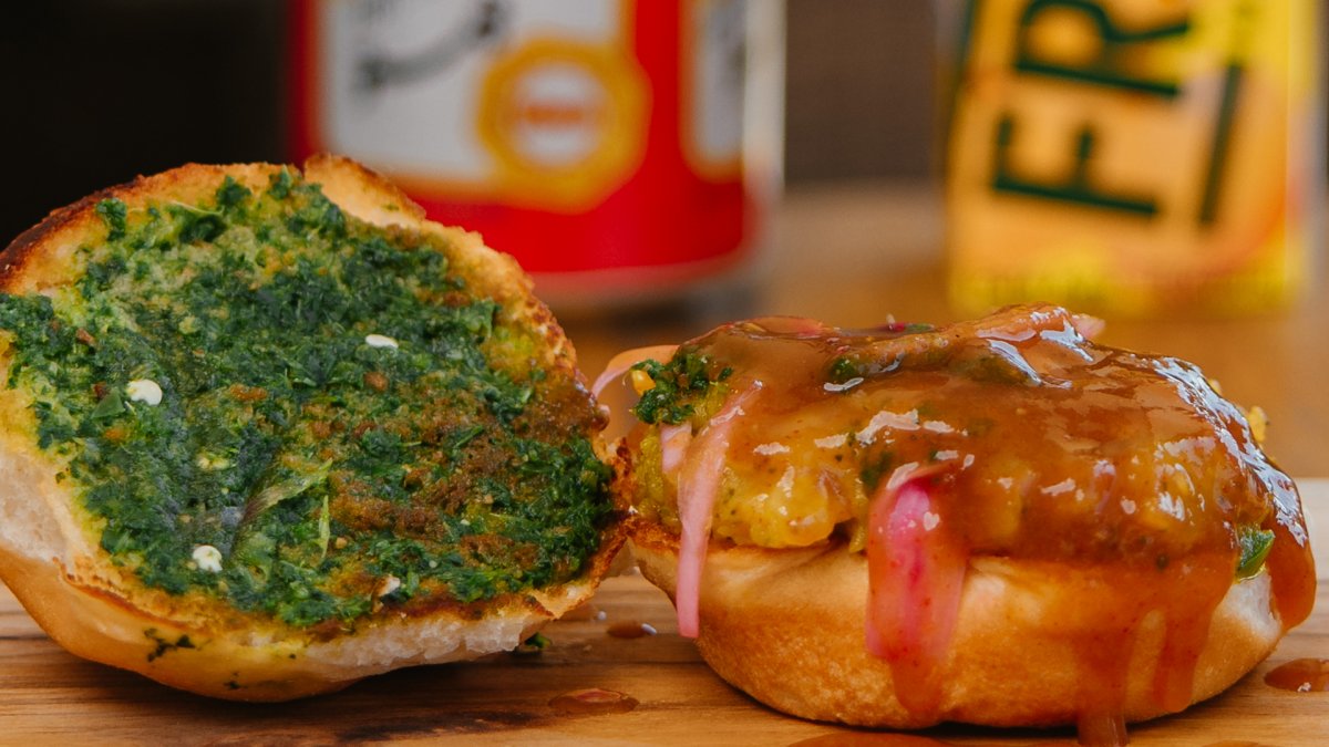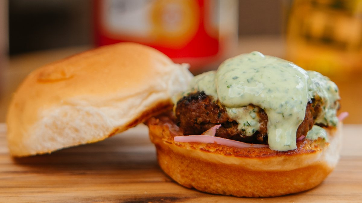 Seekh Kebab SliderGround beef patty marinated in Pakistani BBQ spices, tamarind chutney, pickled onions, and raita on a Hawaiian style slider bun